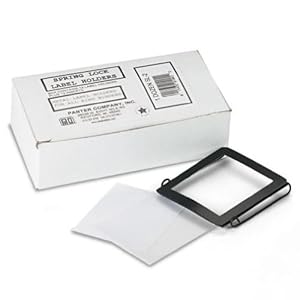 Spring-Lock Metal Label Holders by Panter Company PCISL1 ... 1 X 2-3/4 The "original" spring-lock metal label holder fits tightly over binder spine. Black metal frame has rustproof finish to retain its fine appearance. Clear plastic windows protect the inserted label from soil and scuffing. High-quality steel spring wire clips have a reverse bend to guard valuable papers from accidental damage.