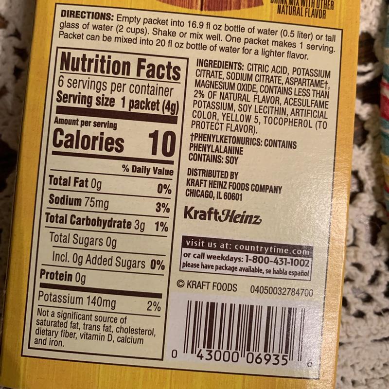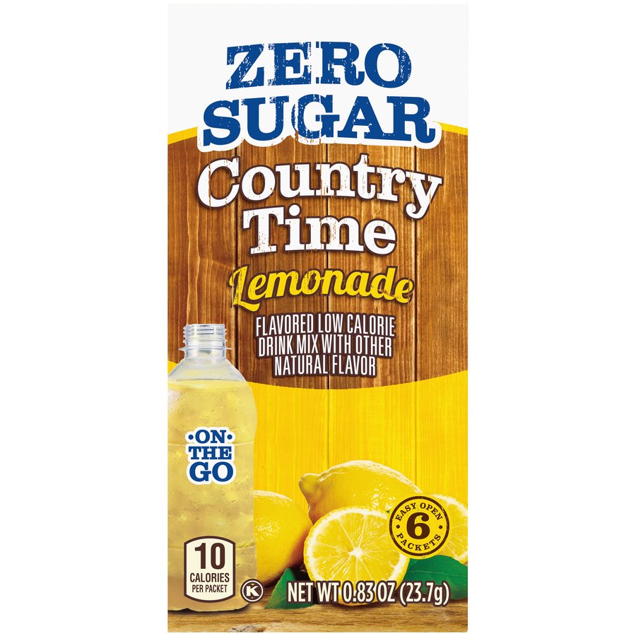 Country Time Lemonade - Lot of 6 Boxes - ZERO SUGAR - SINGLES TO GO ... Details about Country Time Lemonade - Lot of 6 Boxes - ZERO SUGAR - SINGLES TO GO Drink Mix See original listing. ... Calories per Serving: 10. Flavor: Country Time Lemonade. Modified Item: No. Brand: Country Time. Food Aisle: Pantry. Type: Flavor Packets. Volume: 0.9 oz each. Style: N/A.