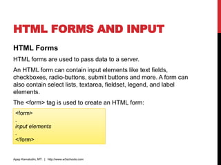 Document Object Model HTML - W3 Jan 09, 2003 · 1.1. Introduction. This section extends the DOM Level 2 Core API [DOM Level 2 Core] to describe objects and methods specific to HTML documents [], and XHTML documents [].In general, the functionality needed to manipulate hierarchical document structures, elements, and attributes will be found in the core section; functionality that depends on the specific … › learn-html › html-input-tagHTML Tag - W3docs Indicates the form (specified by the element) of the control element. The value is the form identifier (id) in the same document. New attribute in HTML5. formaction: URL: Specifies the address where the form data will be sent when clicking on the button. (Used only for and ). formenctype