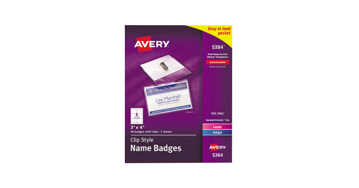 Avery® Top-Loading Garment-Friendly Clip Style Name Tags ... Home Products Name Tags & Badges 5384 . PREMIUM QUALITY Get the quality you expect from Avery, the world's largest supplier of labels. 100% SATISFACTION GUARANTEED No hassles, no hurdles. Because when you're 100% happy, so are we. NEED HELP? (800) 462-8379 ... Popular in Avery templates.