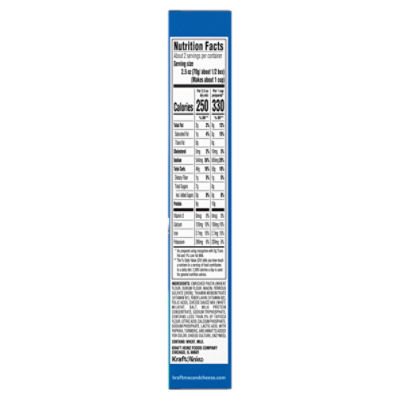Original Cup 2.05 oz | Kraft Macaroni & Cheese enriched macaroni product (wheat flour, glyceryl monostearate, niacin, ferrous sulfate [iron], thiamin mononitrate [vitamin b1], riboflavin [vitamin b2], folic acid); cheese sauce mix (whey, corn syrup solids, milk, palm oil, milk protein concentrate, modified food starch, milkfat, salt, maltodextrin, contains less than 2% of calcium carbonate, …
