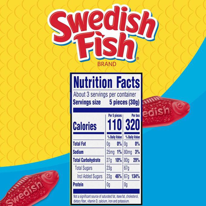 Swedish Fish Ingredients Label : Swedish Fished R U Mad Bro Math Swedish Fish Ingredients Label : Swedish Fished R U Mad Bro Math. Total fat 0g, 0% ; Nutrition facts · calories 110 · % daily value * · total fat 0 g 0.0% · sodium 25 mg 1.0% · total carbohydrate 27 g 10.0% · total sugars 23 g · protein .