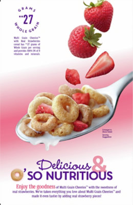 Cheerios Multi Grain Cereal - 18 OZ - Albertsons Cheerios Multi Grain Cereal - 18 OZ. No artificial flavors. Per 1-1/3 Cup Serving: 150 calories; 0 g sat fat (0% DV); 150 mg sodium (6% DV); 8 g total sugars. Gluten free. 28 grams whole (28 g whole grain per serving at least 48 g recommended daily) grain per serving. May reduce the risk of heart disease (While many factors affect heart disease ...