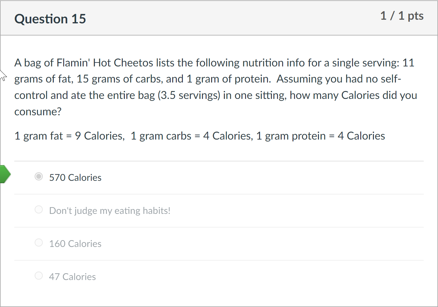 How many calories is a bag of hot cheetos. Is a bag of hot Cheetos going to ruin my calorie deficit diet? Am I ... Answer (1 of 13): Substantial weight gain is a result of a consistently eating more calories than you burn. A 3,500-calorie surplus will cause you to gain 1 pound -- but it's quite hard to eat that much on top of what you need for daily maintenance to gain 1 pound in one night. Even if you had a ... Cheetos - Regular Cheetos Bag calories, carbs & nutrition facts ... Cheetos - Regular Cheetos Bag calories, carbs & nutrition facts | MyFitnessPal Cheetos Cheetos - Regular Cheetos Bag Serving Size : 1 package 310 Cal 34% 26g Carbs 62% 21g Fat 4% 3g Protein Track macros, calories, and more with MyFitnessPal. Join for free! Daily Goals How does this food fit into your daily goals? Calorie Goal 1,690 cal How many calories is in a bag of hot cheetos? - Answers Cheese and chips are both high in fat content, and cause weight gain easily.AnswerOne bag of regular cheetos has about 380 calories and a bag of hot cheetos has about 170 calories. Cheetos has high... Cheetos - Crunchy - Flamin Hot (Large Bag) - MyFitnessPal Cheetos - Crunchy - Flamin Hot (Large Bag) calories, carbs & nutrition facts | MyFitnessPal Cheetos Cheetos - Crunchy - Flamin Hot (Large Bag) Serving Size : 50 g 290 Cal 38% 27g Carbs 60% 19g Fat 3% 2g Protein Track macros, calories, and more with MyFitnessPal. Join for free! Daily Goals How does this food fit into your daily goals?