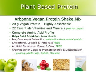 Arbonne Protein Powder: A Healthy Alternative - We Are Eaton Arbonne Vanilla Protein Shake Mix contains 190 calories and 41 g of protein, 20 g of carbs, and 5 g of fiber. In addition, it contains 13 grams of carbohydrates. Five grams of soluble fiber are included in this shake, while five grams of insoluble fiber are included. Side Effects Of Arbonne Protein Shakes