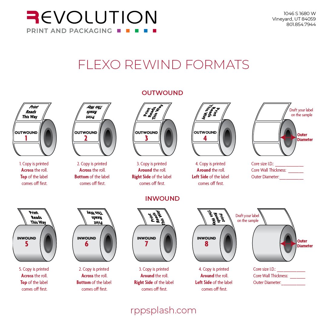 Unwind direction chart. PDF Printing and Winding Design Chart for Roll Labels UNWIND DIRECTION #8 Label on INSIDE of roll. Copy printed WITH the roll. Left side of label OFF FIRST. 985 Seville Road • Wadsworth, Ohio 44281 • 1.800.359.0541 . Title: Wind Chart Created Date: What is Unwind or Rewind Direction? - 4OVER4.COM Help Center The "Rewind Direction" refers to which way the label printing is "right side up" as you unroll your labels to apply them to your products. There are 8 possible orientations for the labels related to how they go onto the final roll. Rewind 1 - 4 are "Wound Out" - the label is facing the outside of the roll and the liner is on the inside. Roll Unwind Directions and Maximum Size - gomlp.ca There are eight unwind directions which describe how the labels come off of the roll. Unwinds are typically important only for automatic and semi-automatic (machine) applications. Hand applications may have preferred unwinds per individual, but are not critical for the end use. ... Refer to the unwind chart to choose the applicable unwind you ... Roll Unwind Direction Chart | Label Directions Infographic Roll Unwind Direction Chart. Syrup Labels. 262.623.6148. Colgate, WI [email protected] Quick Resources. Home; Product Info; Label Portfolio Image Gallery; Maple Syrup Producers; Discounted Seasonal Pricing; FREE Sample Pack; Blog; Other Label Resource and Graphics Sites: Cheese Labels Specialty Food Labels