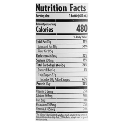 Chocolate Nutrition Shake | fairlife Nutrition Plan™ Drink 10%. Vitamin A 200mcg. 20%. *The % Daily Value (DV) tells you how much a nutrient in a serving of food contributes to a daily diet. 2,000 calories a day is used for general nutrition advice. Contains Milk. Serving Size 1 bottle (414 mL) Servings Per Container 1. Amount Per Serving. Calories 160. Chocolate Milk | Lactose-Free Milk | fairlife Ultra-Filtered Chocolate Milk Ultra-filtered milk is filled to the brim with goodness. Excellent source of Vitamin D Excellent source of Calcium Contains 9 Essential Nutrients Frequently Asked Questions Learn More Explore more fairlife products fairlife® 2% Ultra-Filtered Milk Read More fairlife® Chocolate Core Power® Read More fairlife® 2% Ultra-Filtered Milk Read More Calories in Chocolate Milk Monounsaturated Fat 2.5g. Cholesterol 30mg 10%. Sodium 150mg 6%. Total Carbohydrates 26g 9%. Dietary Fiber 2g 8%. Sugars 24g. Protein 7.9g. Vitamin D 3 mcg 16%. Calcium 286 mg 22%. › calories-nutrition › genericCalories in Chocolate Milk and Nutrition Facts Aug 21, 2007 · There are 190 calories in 1 cup of Chocolate Milk. Calorie breakdown: 24% fat, 60% carbs, 16% protein. Common Serving Sizes: Related Types of Chocolate Milk: Chocolate Milk (Reduced Fat) Chocolate Milk (Lowfat) Chocolate Milk (Whole) 2% Reduced Fat Chocolate Milk Skim Chocolate Milk Chocolate Milk (Reduced Fat with Added Calcium)
