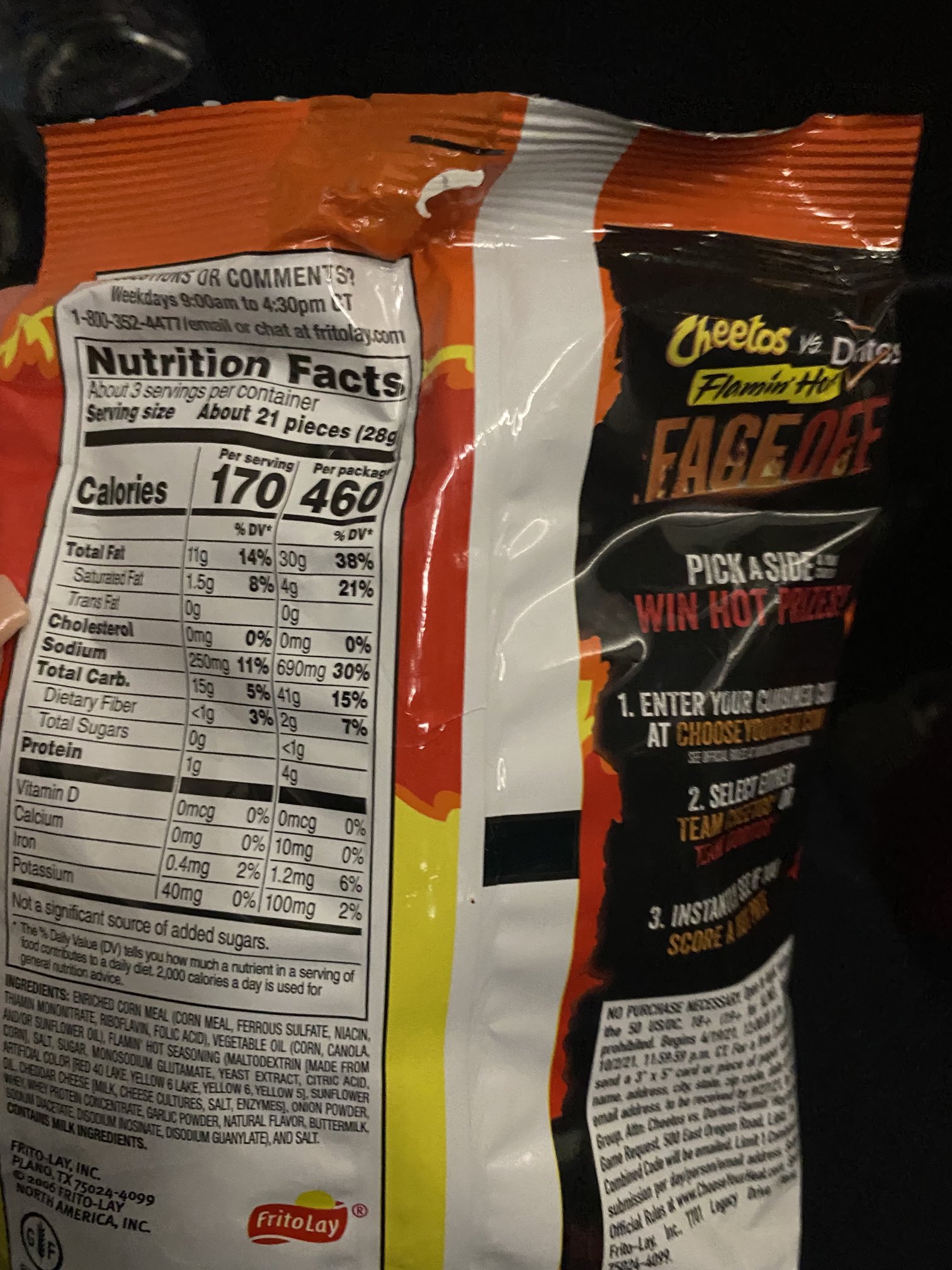 43 how many calories in a bag of hot cheetos