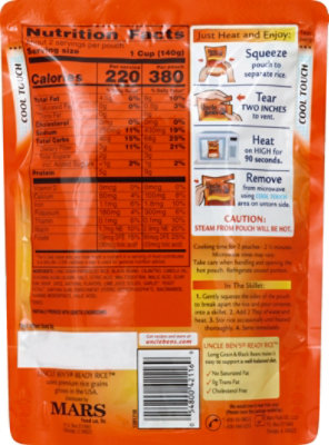 Uncle Bens Ready Rice Orginal - Healthy Heart Market Bens Ready Rice Original - 8.8oz. 2 reviews. $4.89. Qty. Add to Cart. Just Heat and Enjoy! Ben's Ready Rice original long grain makes it easy to support a well-balanced diet. Cholesterol free, Very low sodium, good source of iron and folic acid, 0g trans fat, and no saturated fat! Cook in the microwave or stove top. PDF Uncle Ben's® Natural Whole Grain Brown Rice - aacpsschools.org Uncle Ben's® Natural Whole Grain Brown Rice 2001 E. Cashdan Street, Product Information Sheet Rancho Dominguez, CA 90220 (310) 933-0670 U12111 0 54800 12111 3 Food Service WHOLE GRAIN PARBOILED BROWN RICE. 25 48 Item Code UPC Code Serv Size (g) Unit Net Weight Nutritional Data (unrounded) Calories 172.32 Cal from Fat 12.96 Fat (g) 1.44 Sat Fat ... BEN'S ORIGINAL™ READY RICE™ Whole Grain Brown Rice Cooking instructions. Squeeze READY RICE ™ Whole Grain Brown Rice pouch to separate rice. Tear 2 inches to vent. Heat on HIGH for 90 seconds. Serve immediately. Cooking time for 2 pouches = 2½ minutes. Microwave times may vary. Take care when handling and opening the hot pouch. Refrigerate unused portion.